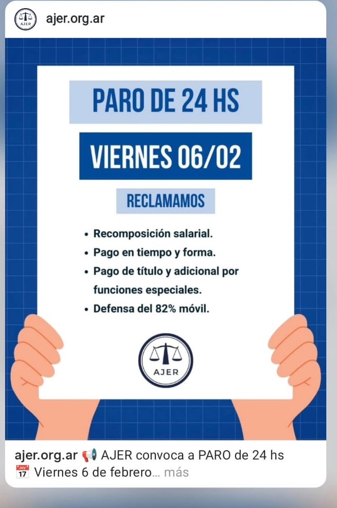 La Asociación Judicial de Entre Ríos (AJER) ha anunciado un paro total de actividades por 24 horas para el viernes 6 de febrero, como parte de su plan de lucha iniciado a fines de 2025.