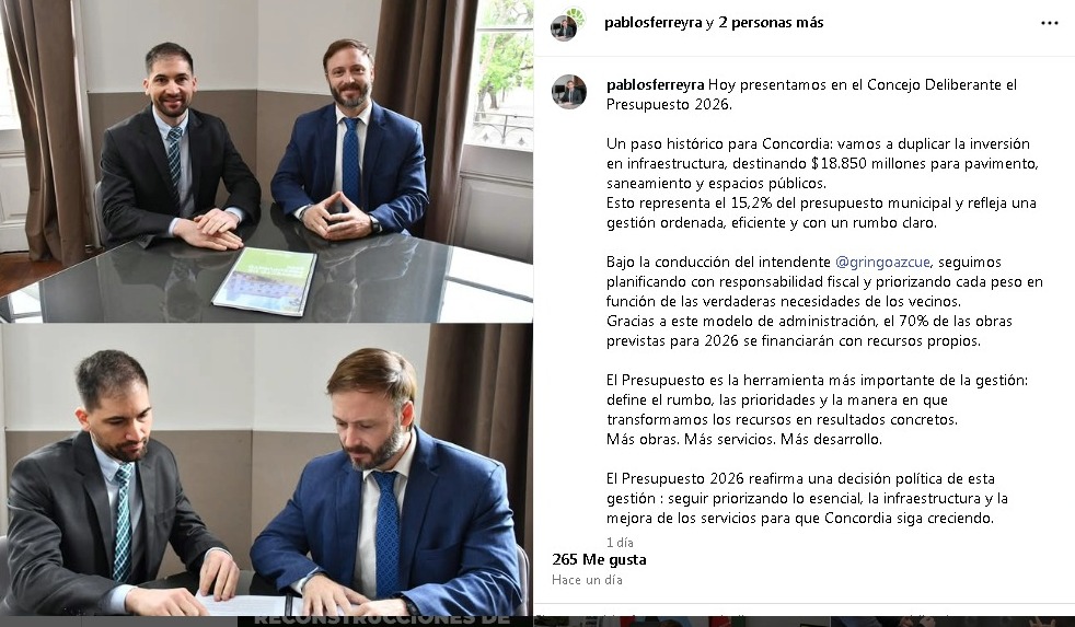 Por su parte, el intendente Azcué señaló que el objetivo para el próximo año es “fortalecer el plan de infraestructura iniciado en 2025, financiado con fondos municipales provenientes del compromiso de los contribuyentes”. Afirmó que “en 2026 se llevará adelante la mayor inversión en obras que se haya hecho en Concordia con recursos propios”.