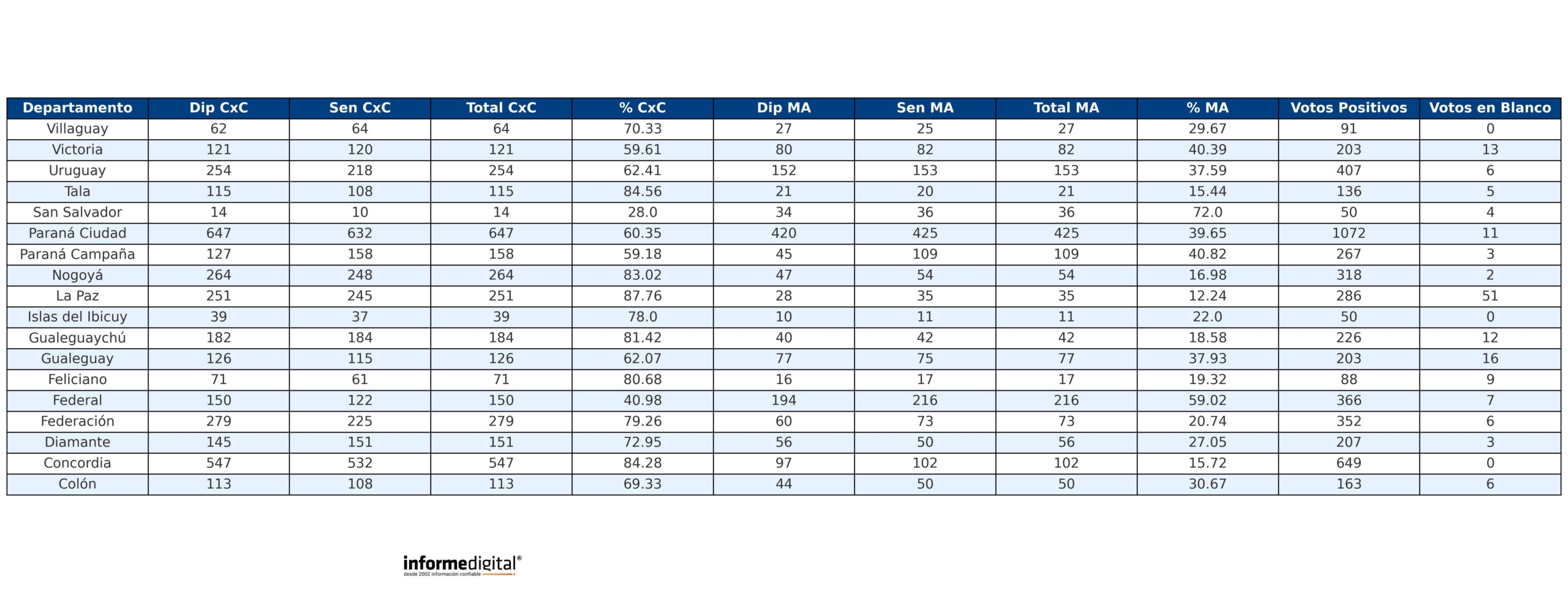 La distancia más grande para la fórmula ganadora fue en el departamento La Paz, donde Benedetti y Schneider sumaron el 87,12% y sus contrincantes por apenas el 12,24%.