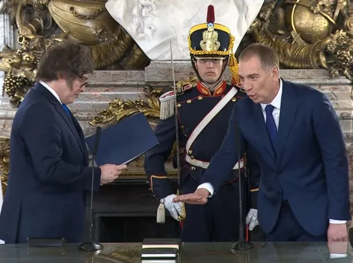 El presidente Javier Milei encabezó este martes el acto de jura de Diego Santilli como nuevo ministro del Interior, en el Salón Blanco de la Casa Rosada. El evento contó con la presencia de familiares, amigos y dirigentes del oficialismo y del PRO.