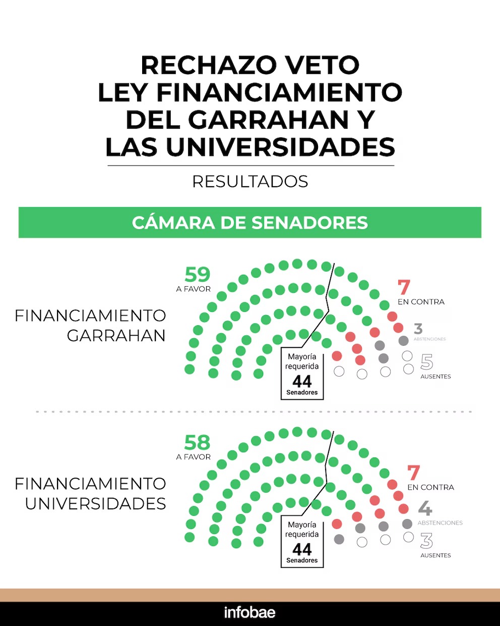En la votación del Senado, la Ley Garrahan obtuvo 59 votos a favor, 7 en contra, 3 abstenciones y 5 ausencias. Por su parte, la Ley de Financiamiento Universitario consiguió 58 votos a favor, 7 en contra, 4 abstenciones y 3 ausencias. Ambas votaciones superaron el umbral de los dos tercios necesarios para insistir con la sanción original de las leyes.