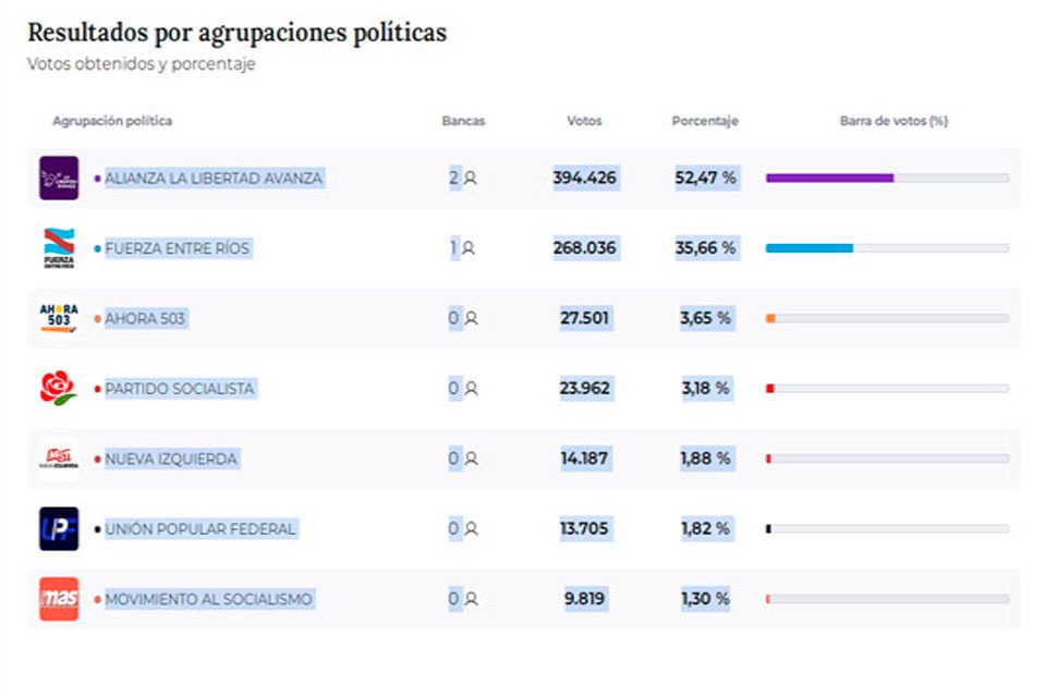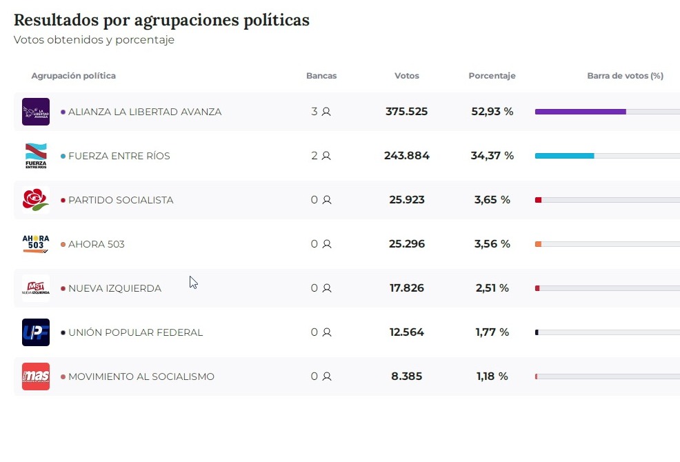 En la votación para diputados, Fuerza Entre Ríos sacó el 34,37 %, el Partido Socialista el 3,65 %, Ahora 503 el 3,56 % y Unión Popular Federal 1,77 %, es decir que en total sumaron 43,35%, considerando los 52,93% de los libertarios, la diferencia hubiese sido de 9,58.