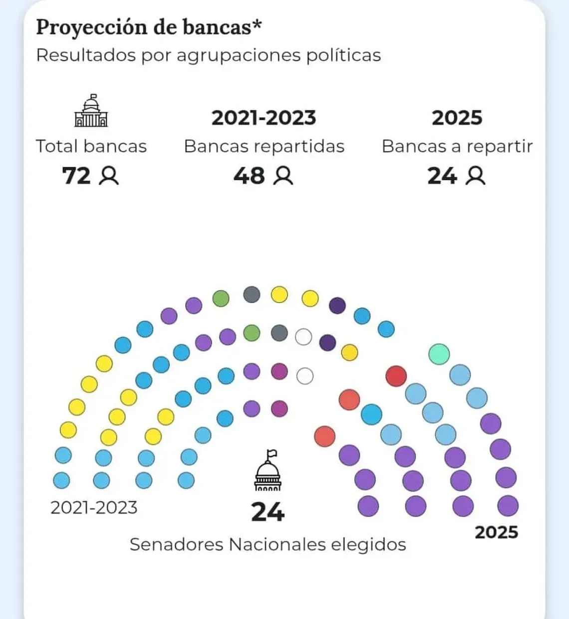 En el Senado, el panorama reflejó una división equilibrada. La Libertad Avanza y el PRO alcanzaron 24 escaños, la cifra necesaria para sostener los vetos presidenciales. De esa manera, podrían constituirse como la primera minoría si el peronismo continúa dividido en dos bloques. El tercio restante de la Cámara Alta quedó conformado por nueve senadores radicales y representantes de fuerzas provinciales.
