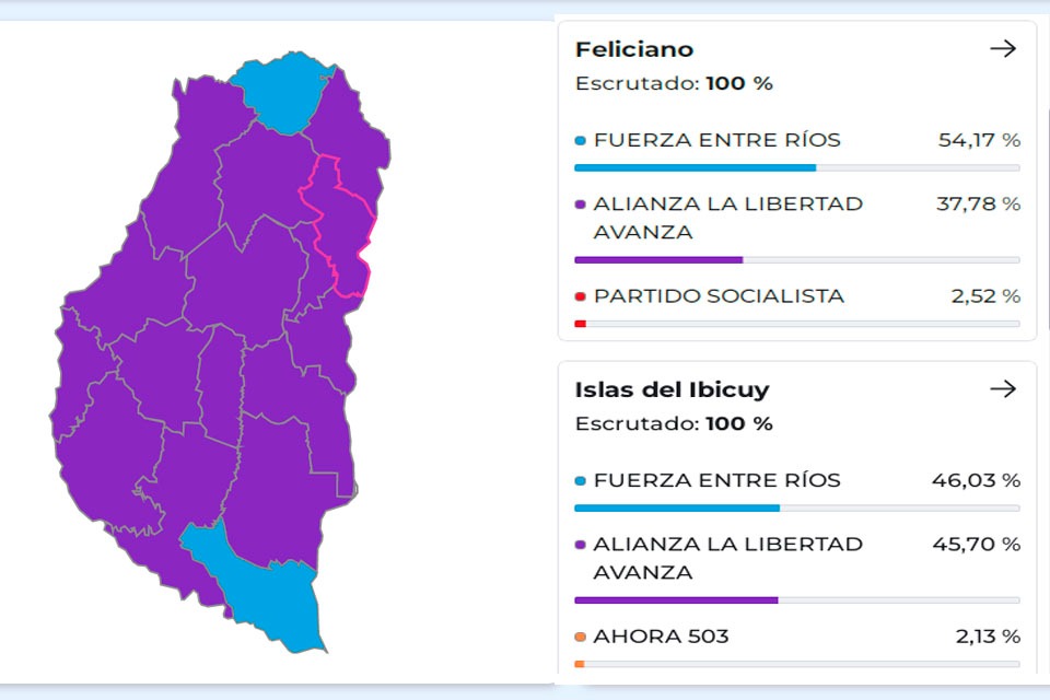 En este caso, se repitieron Islas del Ibicuy, con 46,74% para el PJ y 45,18% para el partido violeta; y Feliciano, en el que la oposición sacó el 54,52% y el oficialismo provincial el 37,79.