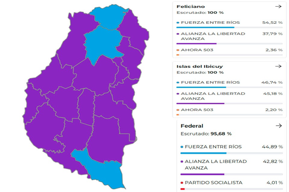 Esto le permitió al frente conformado por el oficialismo provincial y los libertarios cosechar triunfos en casi todos los departamentos entrerrianos, siendo muy pocos en los que se impusieron los candidatos del Partido Justicialista.