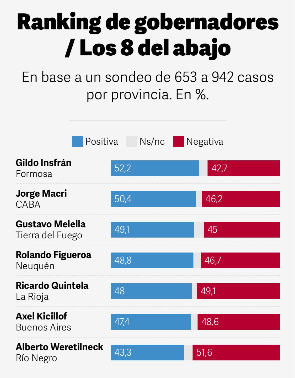 En contraste, el bonaerense Axel Kicillof figura en el puesto 23°, con 47,4 % de imagen positiva y 48,6 % negativa, una de las peores evaluaciones del país.