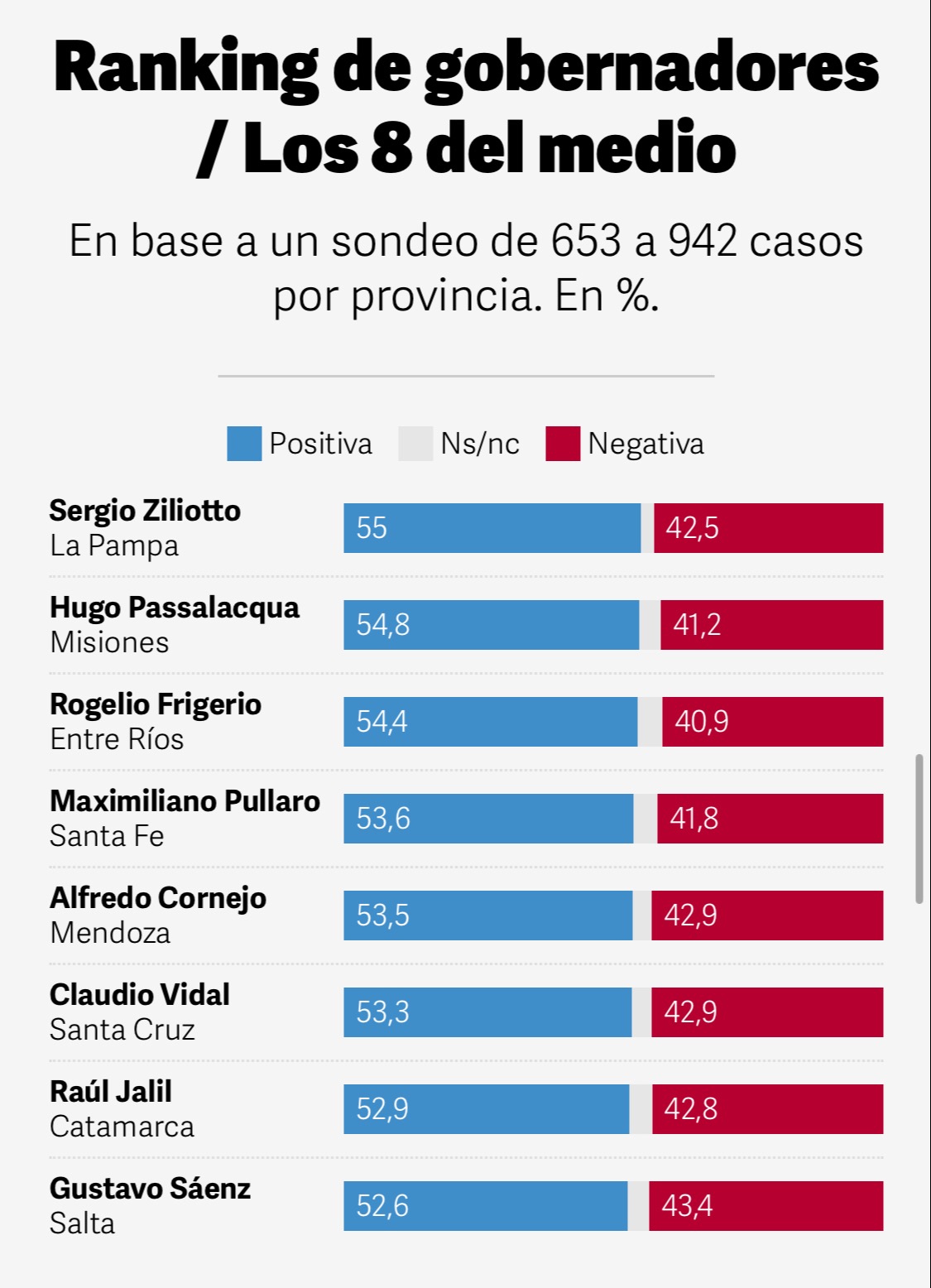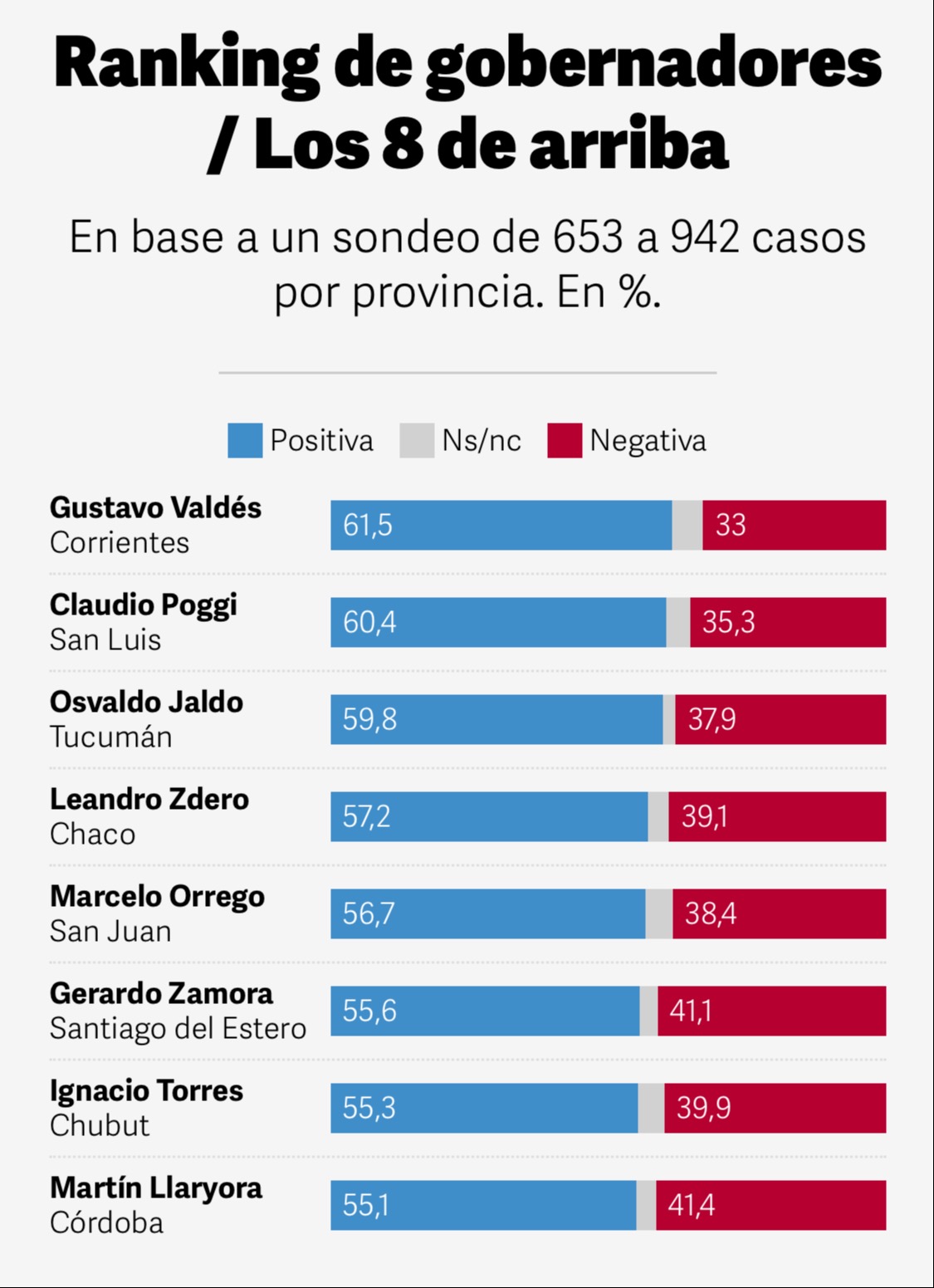 El primer lugar fue para Gustavo Valdés, de Corrientes, con una imagen positiva de 61,5 %, seguido por Maximiliano Pullaro (Santa Fe) y Alfredo Cornejo (Mendoza), lo que confirma el predominio de los gobernadores radicales en las primeras posiciones.