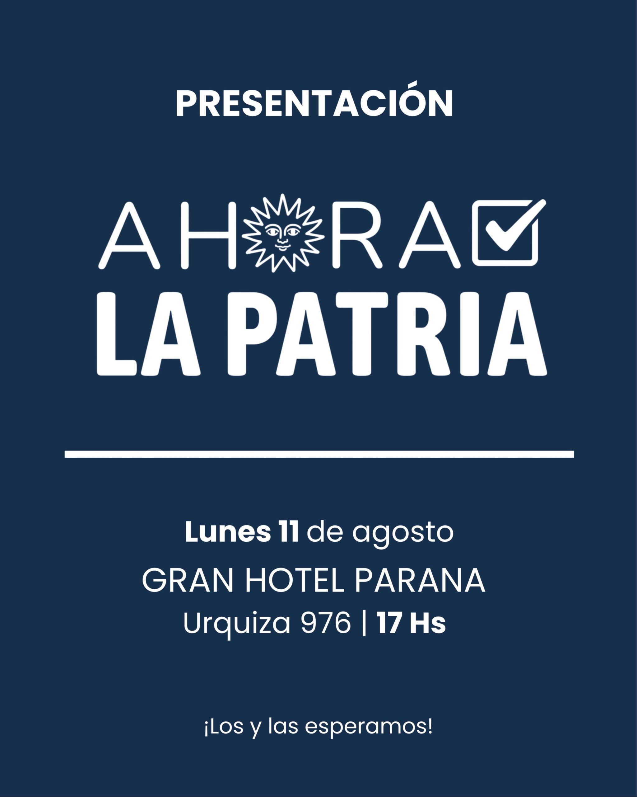 El lanzamiento de la lista “Ahora la Patria” se realizará de 17 a 19 horas en el Gran Hotel Paraná, con la presencia de todos los candidatos que competirán por la renovación de bancas en el Congreso. La coalición está encabezada por el Frente Grande e integrada también por Patria Grande, el Partido Solidario, Nuevo Encuentro y el Partido Comunista, conformando un armado con fuerte impronta kirchnerista.
