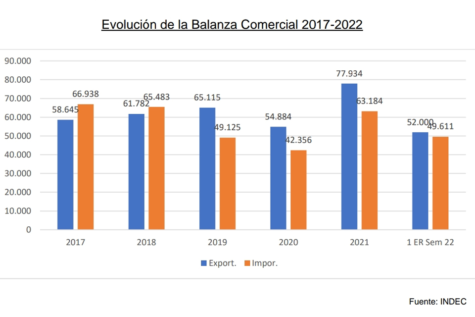Como se puede verificar en el gráfico,en los años 2017 y 2018, la Argentina tuvo déficit fiscal. La misma se compensa, con superávit, en los años 2019, 2020 y 2021. Ya para el corriente año, la abultada diferencia de exportaciones e importaciones, se tiende a equilibrar, y según las proyecciones, cerraría el año con déficit comercial. En rigor, pone en relieve que el comercio exterior y las posibilidades de generar divisas sin una política macroeconómica, no generaría los resultados previstos.