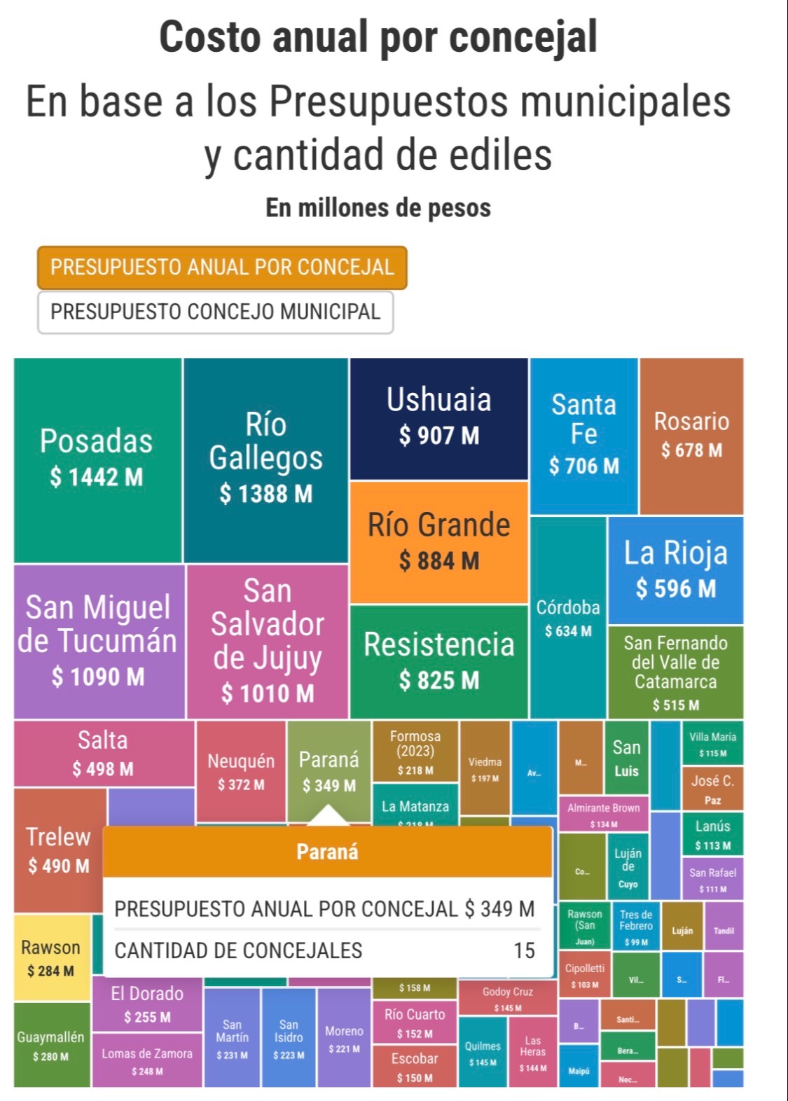 El costo político en Paraná tendrá un incremento significativo en 2025. Según datos difundidos a partir del relevamiento anual de Fundación Libertad, cada concejal costará $349 millones en el presupuesto municipal de este año. En 2024, el gasto por edil había sido de $199.576.392, por lo que el aumento nominal alcanza el 74,8% en solo un año.