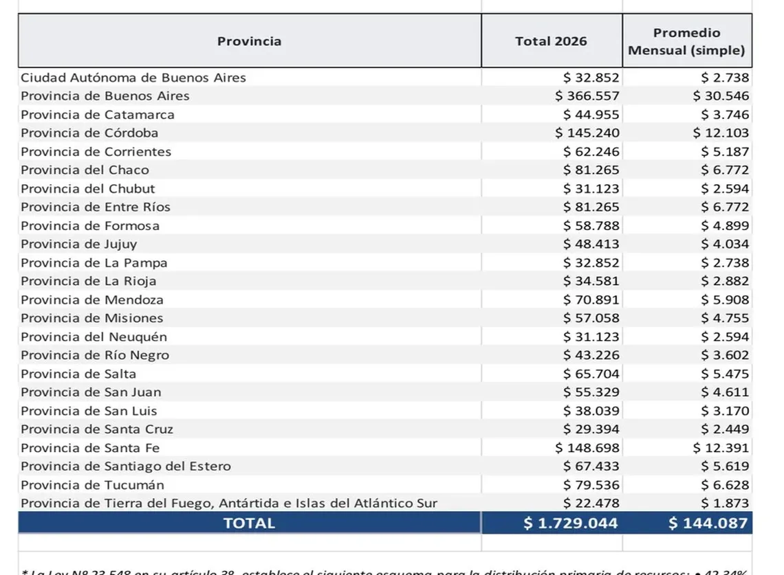 El impacto también se trasladará a las provincias. Por la aplicación de la ley de Coparticipación Federal, $1,7 billones de la pérdida de recaudación recaerán sobre las jurisdicciones, lo que representa un promedio mensual de $144.000 millones menos durante 2026. Buenos Aires, Santa Fe y Córdoba figuran entre las más afectadas, con recortes anuales que superan los $145.000 millones en cada caso.