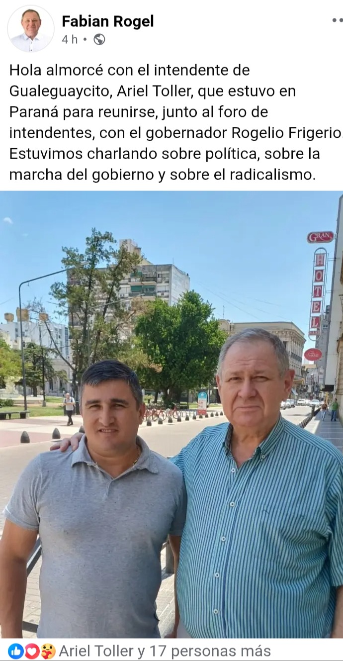 Tal es el caso del diputado provincial Fabián Rogel, quien en sus redes dio cuenta de un almuerzo que sostuvo con un dirigente cercano, como es el intendente de Gualeguaycito, Ariel Toller.