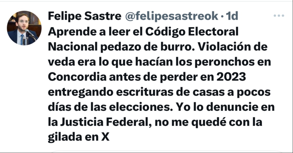 Paradójicamente, quien retuiteó el mensaje de Topo Rodríguez fue Marcelo Casaretto, exdiputado nacional por Entre Ríos, que en 2019 fue denunciado por violar la veda electoral durante la campaña provincial.